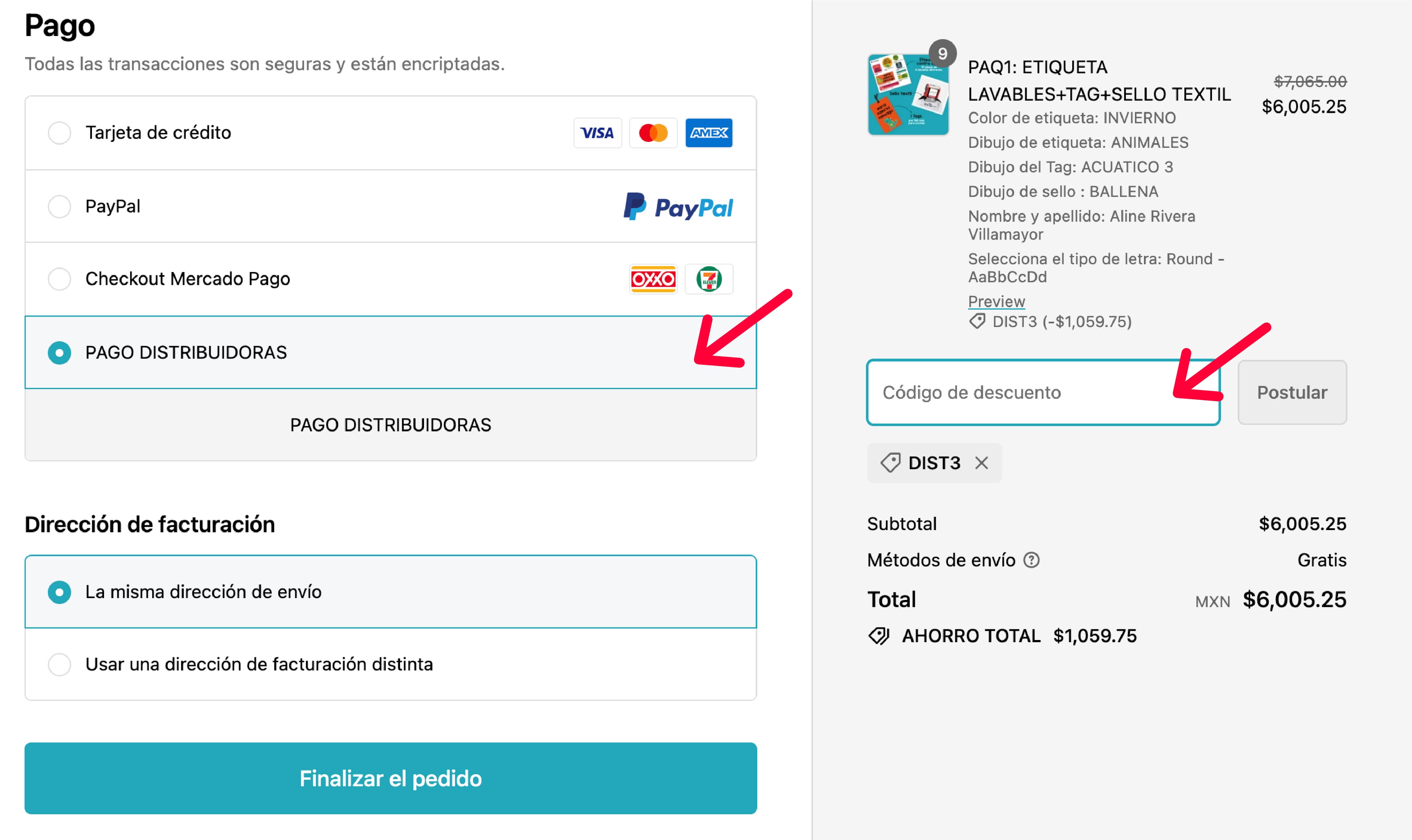 - En el checkout del carrito agrega el CÓDIGO que corresponda al mínimo de venta.