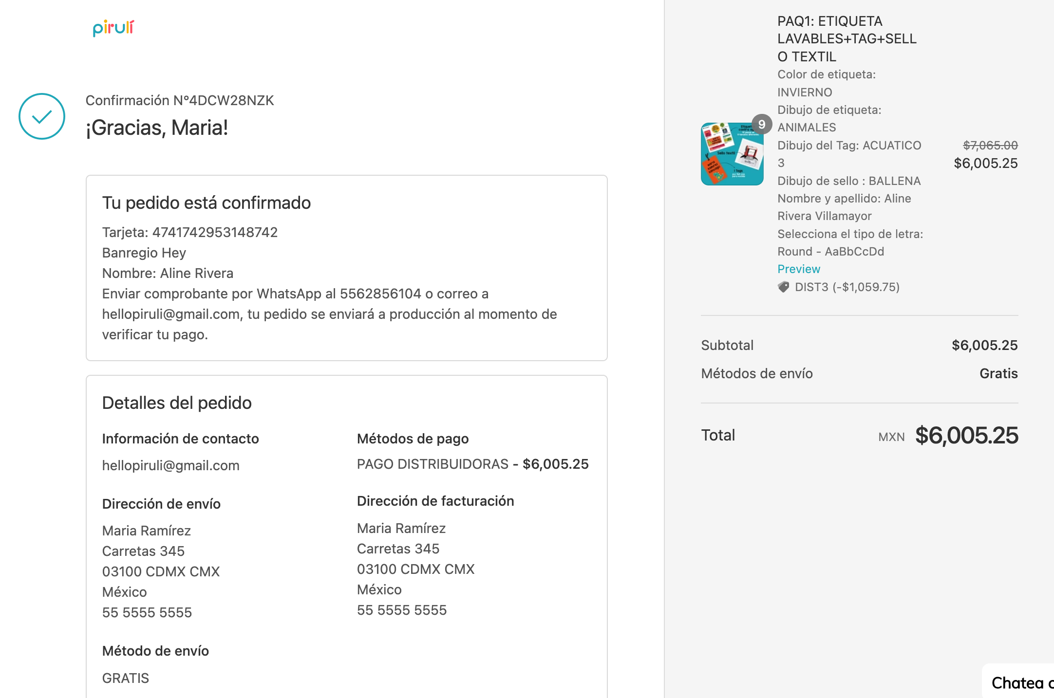 ➡️ Si algún cliente es foráneo y quisiera su envío por paquetería, tendrás que cobrar el envío aparte para que Pirulí lo envíe directo. El costo del envío es de $135 pesos.